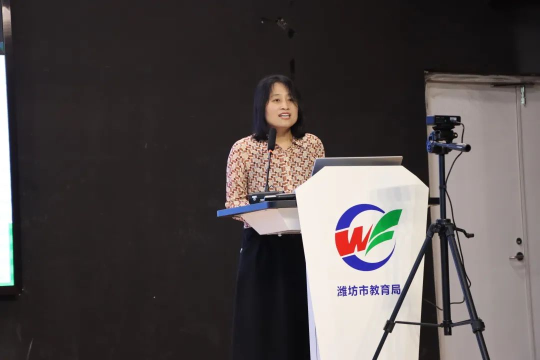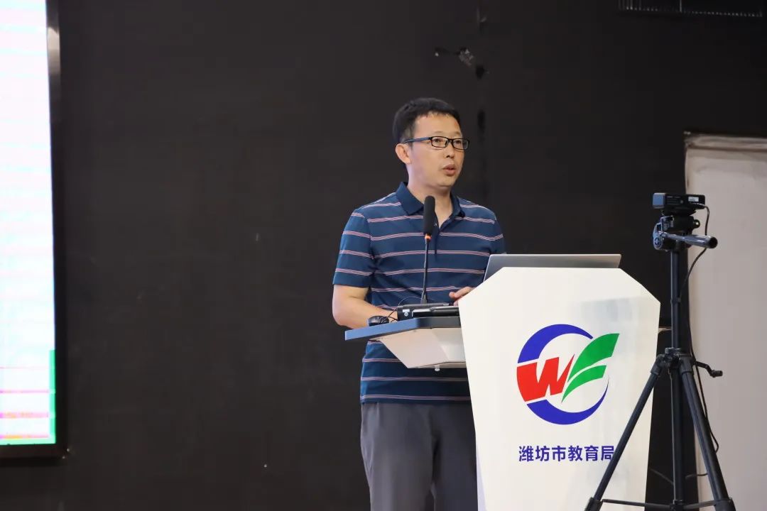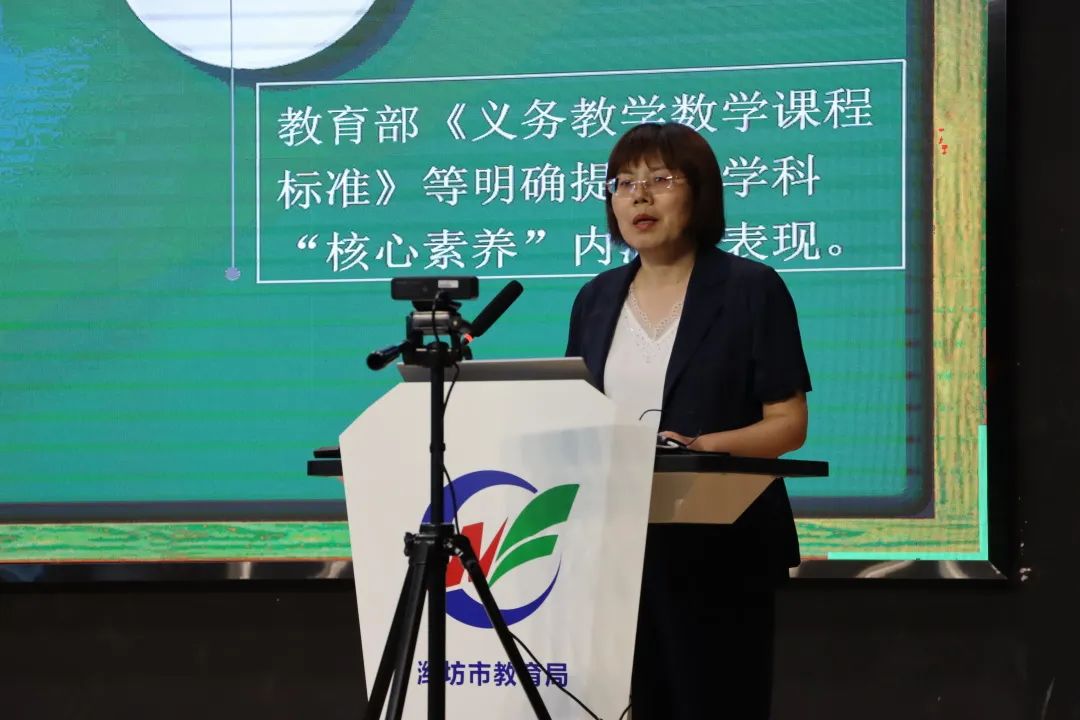 下午,寿光市田柳镇实验小学李映美、高密市豪迈小学张金玲、潍坊外国语学校李遵德、潍坊歌尔学校乔永涛、奎文区宝通街小学王向红分别做了《往高处立,向素养行》、《新课标中“数量关系”的分析与思考》、《对新课标的几点理解与思考——图形与几何》、《重构内容体系实施主题学习培养核心素养》的阶段性研究报告。